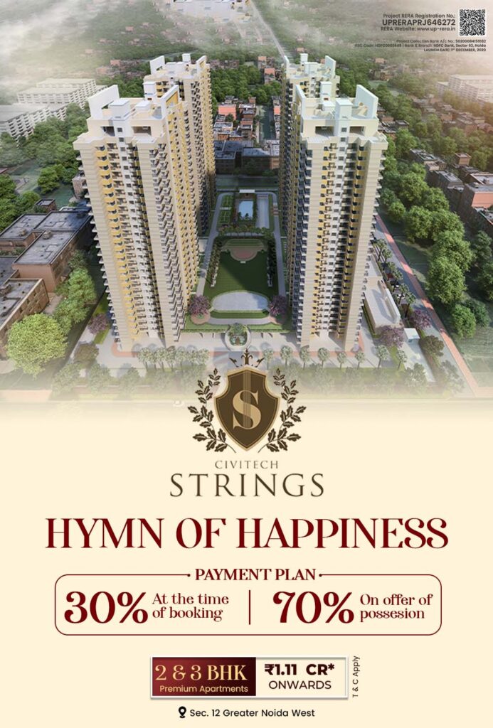 Civitech Strings is centrally located in the prime area of Noida having quick connectivity to banks, malls and commercial zones. Here, you will get a comfortable lifestyle in its well-made 2 BHK and 3 BHK luxurious apartments. Civitech Noida offers a safe and roomy living space surrounded by rich vegetation with a fully guarded community and four well-planned towers. The initiative is meant to provide happy living in the centre of a growing city so that daily serenity, security and luxury are given to the residents of this property. Civitech Strings is meant to provide neighbours with a nice living together with well chosen conveniences. The project offers children's play areas, a clubhouse, a gymnasium, well-kept gardens and lots of parking places among other things. From tastefully designed homes to open grassy areas, Civitech Strings Noida Extension has everything you need for a contented and laid-back lifestyle.